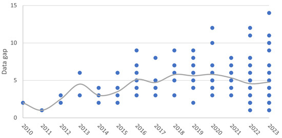 In addition, Figure 4 shows that variability in the gap between papers’ publication years and the most recent data used in their empirical analysis has been growing, suggesting that new models are still tested on relatively old datasets. (Please note that for presentation purposes, two outliers were removed in Figure 4—one exploring natural disasters that happened 20 years before publication, and its value exceeded the scale and another one exploring the pandemic which happened the same year with empirical data only for a few months). Still, the calculated average of the gap remains relatively stable.