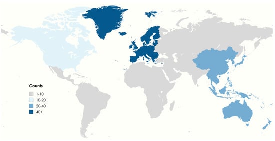 Information about which groups of countries were researched in the empirical analysis was collected for 144 papers (minus 2 for which geographical information could not be extracted with full confidence). One empirical paper could include data from multiple geographical clusters; thus, 148 data points were available. Of 148, most were in Europe—85 (57.43%). East Asia and the Pacific were in second place with 35 (23.65%) papers (32 coming from China). The rest of the geographical clusters only had a small fraction: North America—thirteen (8.78%) (all thirteen coming from the USA); the Middle East and North Africa—four (2.70%) (only represented by Turkey); Sub-Saharan Africa—four (2.70%); Central Asia– three (2.03%) (only represented by Russia); Latin America and the Caribbean—three (2.03%); and South Asia—one (0.68%). The representation of geographical clusters on the world map can be found in Figure 5.