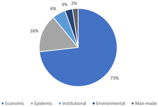 A total of 112 papers out of 174 focus on specific shocks. Note that one paper can include multiple shocks with the same or different origins, so 127 data points were collected. The distribution of shock origins is as follows (Figure 6): the majority—93 (73.23%)—were economic; 20 (15.75%) were epidemic; 7 (5.51%) were institutional; 4 (3.15%) were environmental; and 3 (2.36%) were man-made. Two types of shock origins did not appear in the empirical papers—organizational and technological. Of all shocks, two specific shocks dominated the research—92 papers explored the Great Recession shock of 2007–2009, and 20 papers explored the recent COVID-19 pandemic. The rest of the specific shocks only had one or two papers focusing on them.