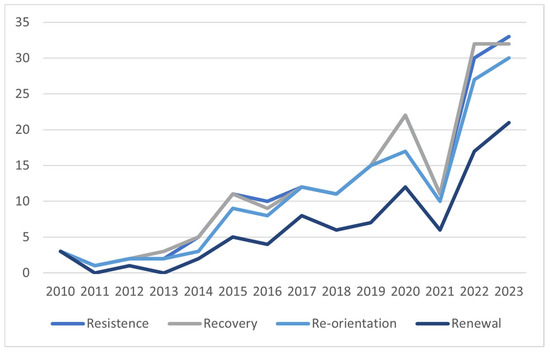 As Figure 7 shows, all types of resilience are discussed, starting with the earliest eligible papers. Still, the most advanced type, i.e., renewal, always lags behind the other types. Note that this might be due to the similarities between re-orientation and renewal. Some authors might have treated them as the same evolutionary concept. During the analysis of the selected articles, it was often difficult to distinguish whether the authors of the analyzed paper meant only re-orientation, renewal, or both. In short, the certainty of the definition of renewal type across articles was lower than that of the other types.