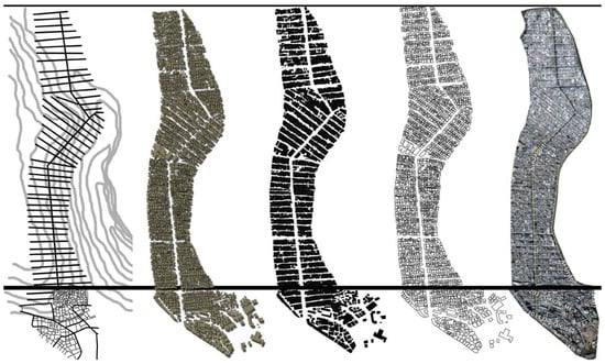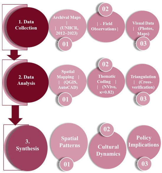 As illustrated in Figure 5, the research methodology follows a three-stage workflow: data collection (archival maps, field observations); analysis (QGIS mapping, NVivo coding); and synthesis of socio-spatial patterns and policy implications. These datasets contextualize temporal shifts in infrastructure, shelter clustering, and cultural adaptations, such as the conversion of public spaces into private extensions.