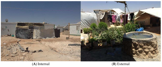 At the unit level, physical adaptations reveal a shift from standardized tent shelters to personalized permanent structures. Refugees have reconstructed shelters, decorated facades, and expanded vertically, reflecting the principles of batin (interior) and zahir (exterior) inherent to Arab–Islamic urbanism [44,45,46]. These inward-focused living spaces prioritize familial privacy while maintaining interdependence through shared communal areas, echoing the duality of interior/exterior spatial dynamics characteristic of traditional Arab–Islamic cities. By transforming formal grid layouts into organic settlements, refugees in camps like Al-Hussein and Zaatari recreate urban patterns that resonate with their cultural identities and communal practices. Such adaptations underscore the necessity of integrating socio-cultural values into urban planning, particularly in displacement contexts where the “right to the city” remains contested [44,46].