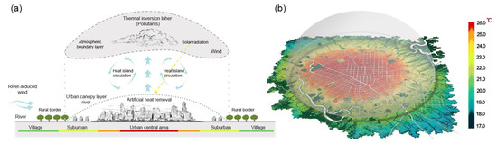 Urban Heat Island effect (a); a numerical simulation of UHI effect (b).