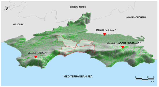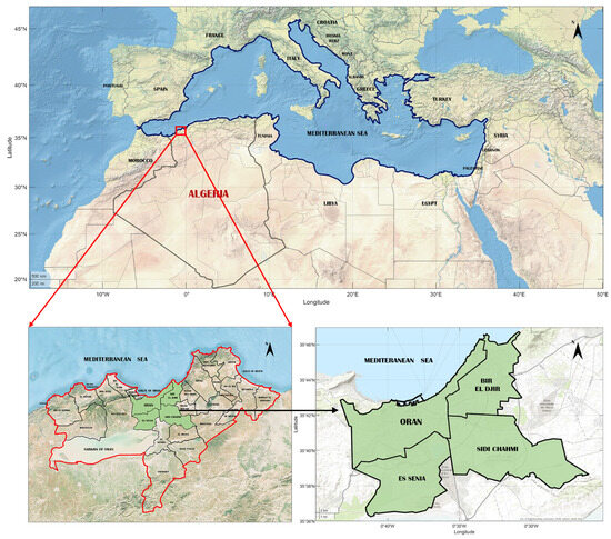 Oran is a coastal city located in the Mediterranean Basin, in the northwest of Algeria, nestled at the head of a bay opening onto the Gulf of Oran, with a coastline approximately 70 km in length. It is situated between latitudes N and N, and longitudes W [29] and W. It is delimited to the east by the Mascara province, to the south by the Sidi Belabess province, and to the Ouset by the Ain-Temouchent province. As the country’s second-largest city and its economic capital, Oran covers an area of about 2121 km2 [30] (Figure 2), while the region of interest represents of the total area of Oran, that is, about 216.63 km2, and encompasses four municipalities: Oran, Bir El djir, Es Senia, and Sid Chahmi (Figure 2).