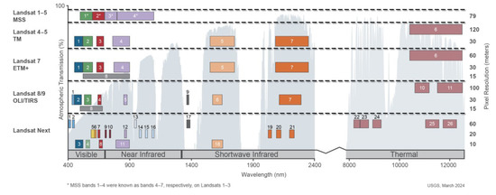 - USGS. Spectral Bandpasses for All Landsat Sensors. Available online: https://www.usgs.gov/media/images/spectral-bandpasses-all-landsat-sensors (accessed on 11 November 2024).