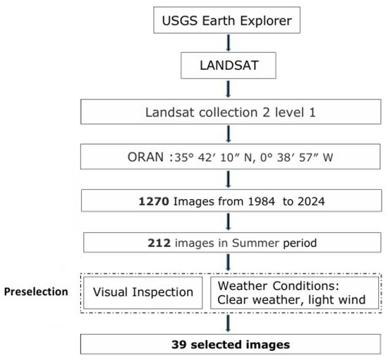 For this study, we utilized Level 1 images from Landsat Collection 2, accessible through the Earth Explorer platform of the United States Geological Survey (USGS) [29]. A total of 1270 images, acquired from the Landsat 4–5, Landsat 7, and Landsat 8–9 satellites, covering the study area, were collected from the period between 1 January 1984 and 1 October 2024. However, only 212 images acquired during the summer period (from 21 June to 21 September) were selected. This period is characterized by an intensification of the UHI effect, due to the long duration of daylight hours and the increased solar radiation absorbed by urban surfaces. To ensure the accuracy of the results, images affected by cloud cover were systematically excluded. Although advanced cloud correction techniques are available in the literature, these were beyond the scope of the present study. Additionally, a selection of days with favorable meteorological conditions for studying the phenomenon, such as high atmospheric pressure, clear skies, and low synoptic winds [37], was made. This resulted in the retention of 39 images: six for June, seventeen for July, fourteen for August, and two for September. The selection procedure is illustrated in Figure 5.