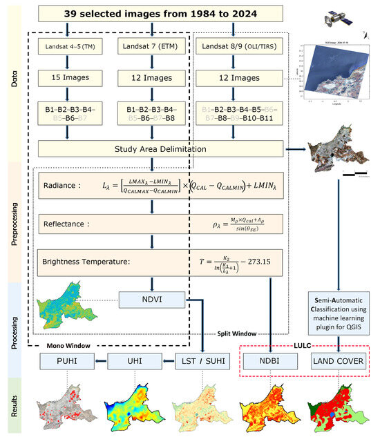 In our study, the methodology illustrated in Figure 6 was applied. We used 39 Landsat images, which were preprocessed and processed using MATLAB R2022. This allowed for the extraction of biophysical indices, particularly the NDBI, to identify built and non-built areas. To refine LULC data and analyze urban sprawl, a semi-automatic classification was performed using QGIS software version 3.10.5. Additionally, the NDVI was calculated to analyze vegetated areas, and it was further used to generate LST maps, which helped to estimate the intensity of the SUHI and assess its spatiotemporal evolution. The areas affected by UHI were identified, cross-referenced, and delineated, facilitating the determination of zones impacted by PUHI.