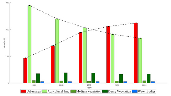 For this class, the area was 0.4 km2 in 1984, representing of the studied zone. This area has gradually increased, reaching 1.16 km2 in 2000 () and 2.17 km2 in 2024 (), with an average increase of approximately 0.07 km2 per year.