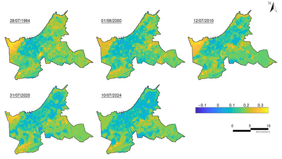 The NDVI is a key indicator for assessing urban climate and vegetation cover. It ranges from to [43], where high positive values (close to ) indicate a high presence of vegetation, low positive values correspond to bare soil or built-up areas, and values approaching zero or negative values (close to ) are associated with water bodies. NDVI provides essential information about vegetation abundance, phenology, and health. This index is computed using the red () band (0.6∼0.7 μm) and the near-infrared () band (0.7∼1.3 μm), according to Equation (5) [44].