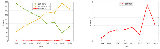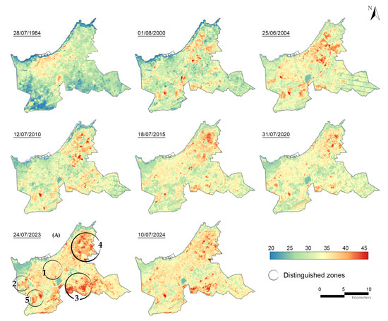 This method was applied to the years 1984, 2000, 2004, 2010, 2015, 2020, 2023, and 2024, enabling the identification of the first class, labeled “Very High”, which represents UHS, indicated by red patches on the maps (Figure 17), obtaned using Equation (14). An additional thresholding process was then employed to generate three complementary categories: “High Temperature”, “Moderate”, and ”Low”, as depicted in Figure 17. These categories enhanced the spatial mapping of UHIs, providing a valuable analytical tool to study their evolution over the specified years.