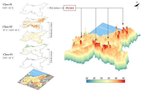 - Class 3 refers to areas where surface temperatures exceed 42 °C, representing the peaks of surface temperatures and designated as hot zones (Figure 13). These zones can be primarily located in four distinct areas: