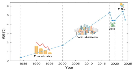 Surface Urban Heat Island (SUHI) evolution from 1984 to 2024.