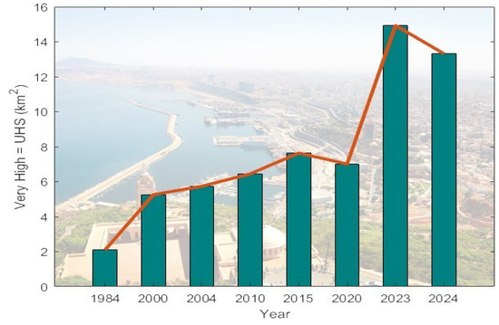 The spatiotemporal dynamics of UHIs in Oran exhibit a similar trend to the SUHI already studied. “Very High” classified zones demonstrated significant growth, increasing from 2.1 km2 (1984) to 13.32 km2 (2024), with an annual average expansion of 1 km2. A notable peak was recorded in 2023 (14.93 km2), coinciding with global warming trends. The COVID-19 pandemic induced a temporary reduction in UHI area (1.51 km2) between 2019 and 2020. By the analysis of the UHI maps of Oran city, another finding revealed a distinct spatial organization, characterized by two contrasting climatic zones. The first is a cooler zone, influenced by the sea breeze, corresponding to the coastal strip along the Mediterranean basin. This zone includes the lower part (level 00) of the city, encompassing the port, the new expressway linking Oran to the east–west highway, and a large portion of the old city center. In contrast, the second zone (level +50 m) is marked by significantly higher temperatures, spatially distributed differently, primarily in densely urbanized areas, as shown in Figure 18.