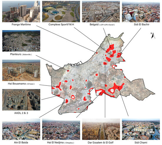 The areas where UHI manifested permanently during the last decades are illustrated in Figure 19, which highlights several significant hotspots. Among these are the Belgaïd district, the coastal fringe, and the newly developed AADL neighborhoods, which are characterized by high-density, closely packed constructions and a notable lack of green spaces. The districts of Sidi El Bachir and Sidi Chahmi stand out due to their predominantly unfinished structures, often left in raw brick form. Additionally, the industrial zone of Haï Nejma Chtaybou, dominated by numerous metallic structures, represents another significant UHI hotspot. Lastly, the informal Planteurs neighborhood, where rooftops are predominantly made of corrugated metal, also contributes substantially to this phenomenon. Recent studies have highlighted that such stable PUHIs pose a greater danger to resident compared to general UHIs [52,54].