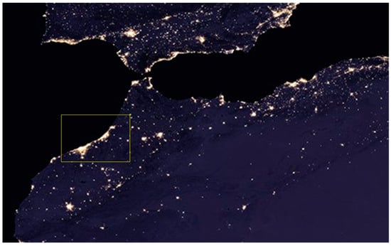 Northwestern African cities as seen by night. The yellow box limits the urban archipelago of interest, generated by the two metropoles of Casablanca and Rabat. Courtesy of the NASA Earth Observatory (2016).