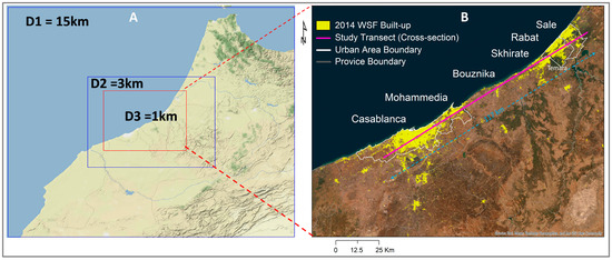 To assess the effects of surface UHIs created by a chain of aligned cities on the vertical temperature and wind fields’ structure, a series of high-resolution numerical simulations using the WRF-model was conducted over a coastal region in northwestern Morocco presenting a chain of cities in proximity along the axis of Casablanca, Mohammedia, and Rabat (Figure 2). The simulations were carried out during summertime from 1 August to 4 August 2014, over three nested domains designed in the study area with a horizontal grid spacing of 15 km (D1), 3 km (D2), and 1 km (D3), respectively (Figure 2A). The period of study was selected to represent a typical summer period with stable atmospheric conditions, high urban heat intensity, and minimal synoptic disturbances, allowing for a clear assessment of the urban archipelago effect. While this study focuses on summer conditions, it is important that future work explores inter-seasonal variations and assesses the behavior of the urban archipelago effect across different climatic conditions. The first 24 h of simulations were used for spin-up time, and the outputs were recorded at 3 h, 3 h, and 1 h intervals for domains D1, D2, and D3, respectively. The simulation results from domain D3 with the finest resolution are used for analysis in this study.