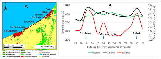 Mean temperature profile across the cities Casablanca, Mohammedia, and Rabat. Panel (A) shows the land cover map and the southwest to northeast axes defining the quadrant where temperature was averaged to construct the profile. Panel (B) shows the actual (black) and vegetation-weighted (green) skin temperatures. Their difference (actual minus vegetation) is shown in red.
