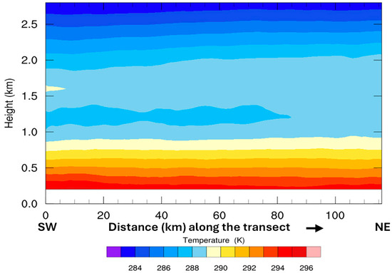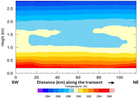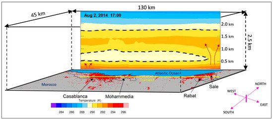 Our model simulations started on 1 August 2014 at 00 a.m. and were integrated forward in time for 96 h over domain D3 shown in Figure 2A. The initial conditions show a thermal stratification in which, at an elevation of about 1 km, a layer of warm air reminiscent of the previous day’s heating is centered at about 1.5 km and extends to about 2.25 km in height. Underneath it is a layer of cooler air overlaying a stable surface of relatively warm air confined to the lowest 500 m with a near surface air temperature of 291 K extending all along the transect between Casablanca and Rabat (Figure 5). By 6 a.m., the surface air temperature has decreased to 290 K over all the urban areas along the transect. However, at 12 a.m., clear heat domes are simulated over the regions of Casablanca and Rabat urban areas with surface air temperatures reaching 295 K and 294 K, respectively. The heat generated over Casablanca is advected by a southwest sea breeze along the coast all the way to Rabat about 90 km northeast. The heat dome over Rabat is further intensified by warm southwest air from the towns of Skhirate and Temara (see Figure 2B). There is a generalized upward conduction of heat all along the transect from the surface to about 1 km. Over the Rabat agglomeration, however, the heat dome has intensified and turned into a plume of eddy vertical heat transport that pierced the lower surface layer to a height of 1.5 km where it formed an anvil (Figure 6). At the surface, all along the transect over the archipelago of cities (Casablanca, Mohammedia, Bouznika, Skhirate, Temara, and Rabat), the first 1 km of the boundary layer has warmed significantly to reach the seasonal average temperature of about 295 K, and by 3 p.m. local time, when the insolation and temperature have reached their maxima, the temperature structure clearly shows the vertical diffusion of heat from the surface with two plumes, in the form of clouds, of heat established over the urban areas of Casablanca and Rabat, extending up to 1.5 km in height where they form anvils at the level of divergent flow and relatively cooler air. This illustrates how thermal and mechanical turbulence combine at the surface to upwardly transport the heat from the domes created over the urban areas (Figure 7). Between 3 and 5 p.m., the anvil over Casablanca dissipates gradually to completely disappear by 4 p.m., while that over the urban area of Rabat persists and still maintains its vertical structure. This is most likely due to the southwest breeze which cuts off the vertical heat diffusion over Casablanca and advects the surface heat towards the region of Rabat. By 6 p.m., the planetary boundary layer (PBL) below 1 km has regained its thermal stratification from 295 K at the surface to 289 K at 1 km. However, the heat anvils over the two urban areas have merged to create a larger but cooler one covering the entire transect from Casablanca to Rabat. By this time, the sea breeze has completely cut off the vertical transport over Casablanca and has significantly diminished it over Rabat (Figure 8). During the first part of the night just after sunset, a net cooling of the surface boundary layer is observed with the 289 K isotherm dropping from about 900 m at 6 p.m. to 600 m at 9 p.m. At that time, the land surface air temperature becomes slightly cooler than the sea surface temperature and generates a land breeze which cools and stabilizes the lower boundary layer. By 9 p.m., the land–ocean temperature contrast has weakened, and the relatively warm air is confined to the first 600 m above the surface (Figure 9).