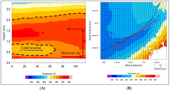 (A) Simulated temperature cross section; dashed contour illustrates the penetration of cool breeze inland (blue line), and the red arrow indicates the vertical diffusion of heat. Panel (B) shows the horizontal wind and temperature at 500 m. The red dashed line shows the position of the transect and the black solid line indicates the coastline boundary. Figures in Panels (A,B) are valid 3 August 2014 at 17:00 UTC.