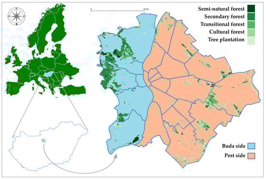 Study area, with the Buda side represented in blue and the Pest side in orange. (Cultural forests meaning extensively managed introduced forests).