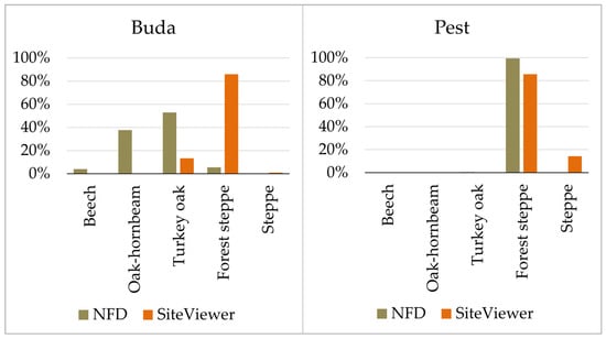 In contrast, the forests on the Pest side are predominantly cultural forests (i.e., extensively managed introduced forests) and tree plantations, with a lower degree of naturalness. Non-native species, such as black locust and hybrid poplars (Populus × euramericana), are overrepresented. These forests are younger, resulting in lower carbon stocks but higher in situ carbon sequestration rates, while also being subject to more intensive logging. Pest-side forests exhibit a higher carbon sink performance despite the considerably harsher climatic conditions compared to Buda, as on the Pest side, only forest–steppe and steppe climate zones are present (Figure 2). The climate classification of the National Forestry Database (NFD) differs somewhat from the categories indicated by the SiteViewer 3.0 [] decision support tool under the RCP4.5 scenario for the 2011–2040 reference period. This discrepancy arises because microclimatic conditions in the Buda Hills may, in some cases, be more favorable than what is suggested by mesoclimatic models. Conversely, the NFD climate categories may sometimes reflect past conditions without fully accounting for the rapid progression of climate change, which significantly impacts many forest species in Hungary due to the proximity of the xeric limit. SiteViewer is a key tool for climate-smart forestry in Hungary, supporting the adaptation of management strategies to both present and future climatic conditions. To maximize the mitigation and adaptation potential of forests, it is essential to integrate data on suitable species recommended by this decision support application into management decisions while also considering subcompartment-level site conditions and microclimatic observations gathered in the field.
