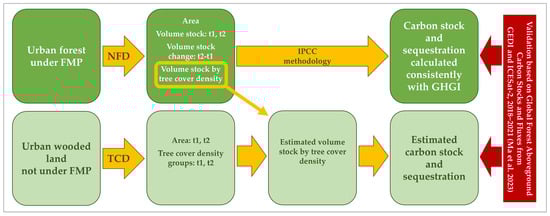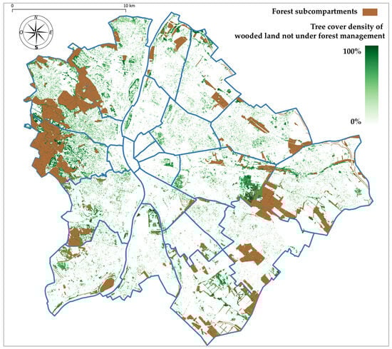 To estimate the carbon sequestration and storage of all other trees within Budapest that are not subject to forest management planning (FMP), data from the Copernicus Land Monitoring Service’s High Resolution Layer Tree Cover Density [,] (hereinafter referred to as TCD2012 and TCD2018) was utilized.