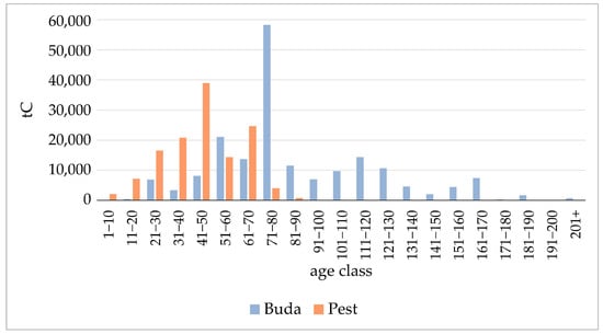 Carbon stock distribution of forests under FMP across different age classes in the Buda and Pest sides of Budapest. (Carbon stock values are expressed in tons of carbon, tC).