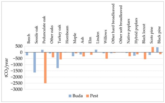 Carbon sinks (negative values) and emissions (positive values) of urban forests under FMP in Budapest, categorized by tree species groups and presented separately for the Buda and Pest sides.