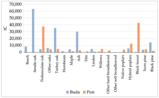 Carbon stock of urban forests under FMP in Budapest in 2020, categorized by tree species groups and presented separately for the Buda and Pest sides.
