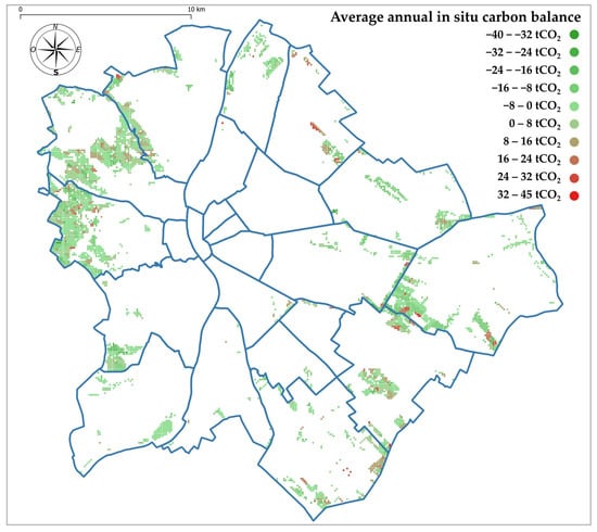 The limitation of our study is the lack of data on soil carbon stock and balance for urban forest areas in Budapest. Soil carbon plays a crucial role in the overall carbon dynamics of urban forests, influencing both carbon sequestration potential and long-term carbon storage []. Without this information, our assessment provides only a partial view of the total carbon balance in urban green spaces. Future research should address this gap to develop a more comprehensive understanding of urban forest carbon dynamics and support more effective climate adaptation and mitigation strategies.