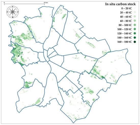 Figure 9 illustrates urban forest areas under FMP (brown) and other urban tree cover based on TCD2018 (green). In 2018, the total area of urban tree cover outside FMP was 6932 hectares. Figure 10 presents carbon stock values by tree cover density classes, derived from areas under FMP within Budapest. These values were then used to estimate the carbon stock of areas with tree cover not under FMP.