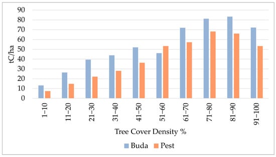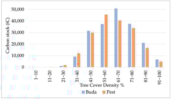 Carbon stock values by tree cover density classes, calculated based on NFD data for areas under FMP within Budapest, separately for Buda and Pest.