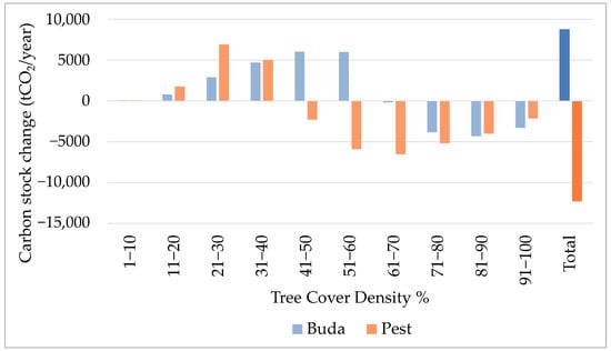 Estimated annual changes in carbon stock of urban trees not under FMP by tree cover density groups, separately for Buda and Pest.