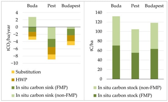 Overview of carbon dynamics and stock in urban forests across Budapest. Left: Average annual carbon sink, harvested timber (HWP) carbon stock, and substitution effects for Buda, Pest, and the entire Budapest area. Right: In situ carbon stock of urban forests and trees in Buda, Pest, and the entire Budapest area.