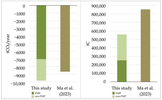 Our results are also consistent with the Hungarian GHGI [], which reports an average annual carbon sink of −2.1 tCO2/ha for forest land remaining forest land across Hungary. According to our findings, the average in situ carbon sink of Budapest’s urban forests under FMP is −1.8 tCO2/ha/year, while Pest-side forests achieve a sink of −2.2 tCO2/ha/year, which is very close to the national average. The validation results indicate that while our above-ground carbon flux estimates are higher—amounting to 114% of those reported by Ma et al. []—our above-ground carbon stock estimates are lower, representing only 65% of their values. Despite these differences, both estimates remain within the same order of magnitude, suggesting that the overall trends are consistent with those reported by Ma et al. [] (Figure 14). The observed discrepancies in carbon flux and stock estimates between our study and Ma et al. [] may arise from several methodological differences. Ma et al. [] relied on remote sensing data from the GEDI and ICESat-2 missions, using lidar-based observations of canopy height in combination with ecosystem modeling to estimate carbon stocks and fluxes. Although this approach provides high-resolution, globally consistent data, it lacks country-specific calibration. In contrast, our estimates are based on ground measurements and country-specific yield tables tailored to Hungarian forest conditions, potentially offering more accurate results. Furthermore, Ma et al. [] incorporated complex model simulations that account for meteorological variability, atmospheric CO2 concentrations, and soil properties, which may contribute to their higher carbon stock values. Differences in the treatment of forest dynamics—such as natural disturbances, mortality rates, and succession—could also explain the divergence in results. Nevertheless, the general agreement in the order of magnitude across studies reinforces the robustness of both approaches and highlights their complementary value in understanding the carbon dynamics of Budapest’s urban forests.