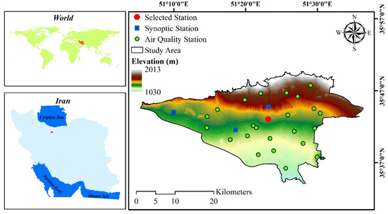 Tehran, Iran’s largest city and capital, spans over 615 km2 and has a population exceeding 9.03 million, as illustrated in Figure 1. Located between 35°31′ and 35°57′ N latitude and 51°04′ and 51°47′ E longitude, Tehran plays a major role in Iran’s economy and industry. However, it faces serious air pollution challenges and is ranked among the most polluted cities globally [19]. Studies show that air-pollution-related mortality in Tehran is significant and alarming [13], especially considering the city’s population of around 9 million, which comprises over 10% of Iran’s total population. Tehran municipality has established 23 air pollution measuring stations, as shown in Figure 1, to monitor air pollution parameters, including ozone (O3), carbon monoxide (CO), nitrogen oxides (NOx), sulfur dioxide (SO2), and particulate matter (PM10 and PM2.5). Additionally, the Iran Meteorological Organization (IRM) has set up three synoptic measuring stations, also illustrated in Figure 1, to track meteorological parameters such as wind direction (WD), wind speed (WS), ambient temperature (TEMP), and rainfall (RAIN).