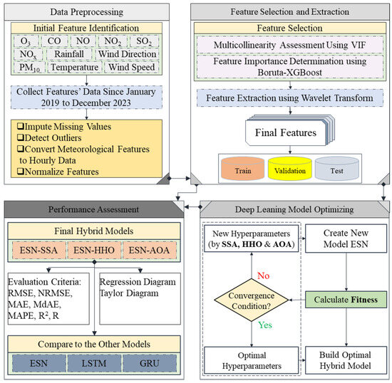 This study uses a hybrid approach to predict PM2.5 concentrations in the Tehran metropolitan area. The key focus is on determining the hyperparameters and weights vectors of the ESN deep learning model. Unlike previous studies that relied on random selection or trial-and-error methods, this study employs a metaheuristic approach for the more accurate and efficient determination of hyperparameters and weights vectors. As Figure 2 and Algorithm 1 illustrate, the proposed methodology consists of four main steps: data preprocessing, feature selection and extraction, deep learning model optimizing, and performance assessment, which are detailed in the following sections.