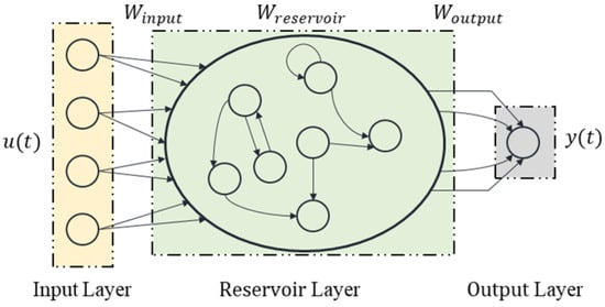 ESN, a deep recurrent network introduced by Jaeger [60], excels in time series prediction and classification [61,62]. The ESN architecture, illustrated in Figure 3, comprises three layers: an input layer with K neurons, a reservoir layer with N neurons, and an output layer with L neurons, where L equals 1 for time series prediction.