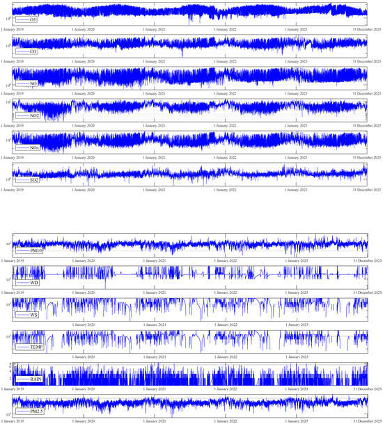 Data Preprocessing: From January 2019 to December 2023, we collected hourly time series data on air pollution parameters and three-hourly time series on meteorological parameters influencing PM2.5 concentrations. The data were first cleaned by filling in missing values using Inverse Distance Weighted (IDW) and Linear Interpolation and identifying outliers with the mean and standard deviation [57]. Then, using linear interpolation, meteorological features were converted to hourly data. Subsequently, the Z-Score method was applied to normalize the time series data.