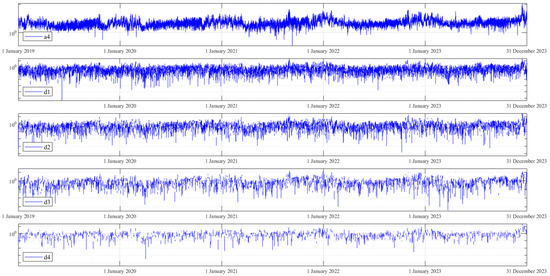 This study employed a Wavelet transform based on the parent “Haar” wavelet to extract new features from each original feature. Through trial and error, the maximum decomposition level was determined to be four, resulting in the decomposition of each feature into five new components: a4, d1, d2, d3, and d4. Consequently, each original feature in the dataset was replaced by these five new features. For instance, as depicted in Figure 6, the feature SO2 was decomposed into five new features (a4SO2, d1SO2, d2SO2, d3SO2, and d4SO2), which replaced the original SO2.
