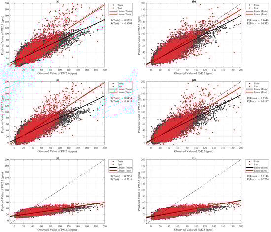 The regression line diagrams for (a) ESN, (b) ESN-SSA, (c) ESN-HHO, (d) ESN-AOA, (e) LSTM and (f) GRU.