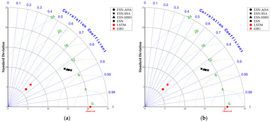 To statistically assess the similarity between the predicted and observed PM2.5 values and to identify the best prediction model for the training and test datasets, Taylor diagrams were prepared and are shown in Figure 9. In these diagrams, the model closest to the observed data is deemed the best for the given objective. The training and test datasets indicate that the optimized and original ESN models are closer to the observed values, while the LSTM and GRU models are not. Thus, the optimized and original ESN model predictions align more closely with the observed PM2.5 concentrations, particularly the ESN-SSA model.