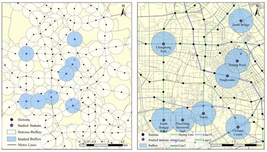 Distance plays a crucial role in shaping individuals’ preferences and behavior when choosing cycling as an access mode. Previous studies have identified the cycling access radius around metro stations in Chinese cities to typically range from 800 to 1600 m [,]. Given the high concentration of metro stations in central Tianjin, a smaller cycling radius of 800 m is sufficient to encompass the primary service areas of the stations; see Figure 1. Therefore, an 800 m catchment area was used for subsequent analysis.