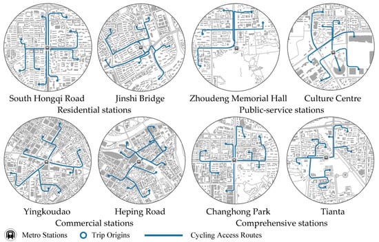 Entrance–exit density along cycling routes is highest around comprehensive and commercial stations, with Changhong Park station (0.97) and Yingkoudao station (0.87) having the highest scores. In contrast, public-service and residential station areas have lower entrance–exit densities, with Zhoudeng Memorial Hall station (0.50) and Culture Centre station (0.55) scoring the lowest. This pattern suggests that the fine-grained and diverse urban structures for land use in commercial and comprehensive station areas lead to more entrances and exits, a characteristic commonly observed in Chinese cities [].