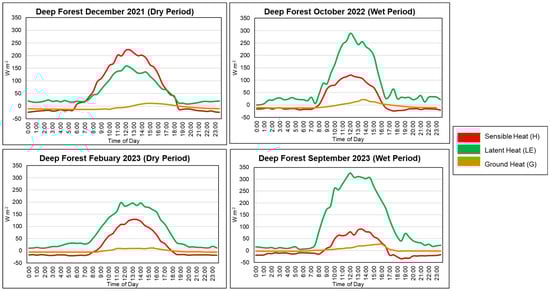 The measurement of ET in forested areas can be viewed as a key component of surface water heat transfer. As the forest expands, its complexity aids in regulating water balance. The intricate canopy coverage resulting from decreased density, coupled with increased height and DBH, contributed to this complexity. Figure 3 demonstrates that during the wet period, the LE was notably higher owing to increased water vapor availability during the rainy season in Thailand. However, the overall trend showed that the net radiation remained relatively constant throughout the measurement period. The increase in LE within the Deep Forest, coupled with the decrease in H, illustrates the impact of green areas [23] also observed that an increase in crown cover promotes higher ET, which in turn increases the water vapor content within the forest area, resulting in a larger LE flux. This is in agreement with other studies [24], in which urban energy balance data derived from the cities of London, Basel, and Heraklion showed that LE was highest in vegetated areas, as moisture advection enhanced LE flux and reduced H.