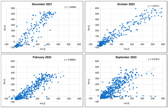 The energy balance ratio = (LE + H)/(Rn − G) was calculated, in which LE and H are the latent and sensible heat fluxes, Rn represents the net radiation, and G is the ground heat flux. The slope values were found to decrease from 1.41, 1.03, 0.96, and 0.91 during the timespan from 2021 to 2023 (Figure 4). This indicates that the turbulent heat fluxes decreased, reflecting that the study contained more available energy, which in these circumstances reflects the land use, referring to canopy storage or photosynthetic heat flux. However, in urban applications, differences in the closure ratio are often referred to as the remaining energy from storage and anthropogenic heat fluxes, which in urban settings are often converted into H and later promote an increase in temperature [30]. According to the acquired data, the decrease in these fluxes was influenced by the increasing dominance and maturity of the Deep Forest area. This shift indicates an increase in LE flux as part of the increasing ET rates as well as in the ground heat flux, which is attributed to the forest floor holding more water owing to natural microbial activities playing a crucial part in the nutrient cycle that supports the growing forest.