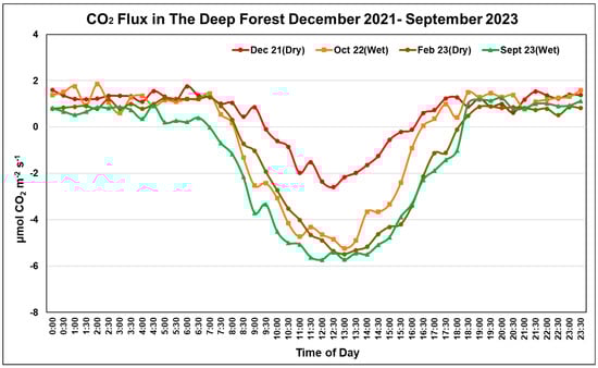 The changes in CO2 fluxes in the Deep Forest from December 2021 to September 2023 are shown in Figure 5, demonstrating the temporal increase in the CO2 flux. Not only did the downward flux peak become stronger, but the area with negative CO2 flux expanded. The average diurnal CO2 flux increased from 3.19 to −3.02 to −5.99 to −6.11 μmol m−2 s−1 in 2023, thereby regarding the Deep Forest site as a carbon sink. This negative increase could be attributed to the growth in the Deep Forest. The parallel increase in tree diameter with the DBH, LAI, and crown canopy coverage facilitates higher gas exchange due to an increased leaf area available for exchange [33,34,35,36].