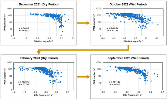 Furthermore, the decrease in density is also an indicator that the forest is reaching its maturity, as succession lowers the density of the forest and increases the crown cover convergence as a result of the larger tree canopy. This increases the CO2 flux within the Deep Forest [37]. An extrapolation of the area’s ability to sequester CO2 is shown in Figure 6, showing the CO2 flux and photosynthesis photon flux density (PPDF) or the light energy in the wavelength used for the photosynthesis process. The temporal changes were seen as an increase in negative flux with increasing PPDF, indicating that the ability to sequester CO2 increased [35,38]. This was then confirmed with the slope and the R2 values that increased with the time in which the forest grew (Figure 6) [39].