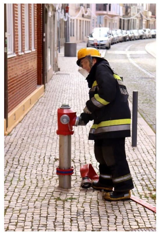 At the beginning of the 19th century, with the progressive generalisation of cast iron networks in several European and American cities, accessories with openings, such as tees, began to be installed along networks at regular intervals, enabling water extraction to combat fire [24]. Initially, water collection was performed using small canvas reservoirs. Later, portable pipes began to be used, connecting at one end to a tee and at the other to a hose connected to a hand pump [24]. Fire hydrants (Figure 1) arose from the need to have an easily accessible above-ground water point for fighting fires.