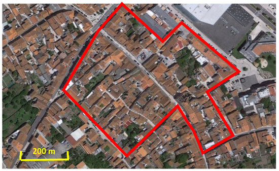 In Figure 2, the area outlined in red represents the area under study. The streets are narrow, with most having dead ends (some are only 2.30 m wide). This circumstance makes vehicle access difficult, especially for larger ones, such as firefighting vehicles. These streets are mostly made of cobblestone.